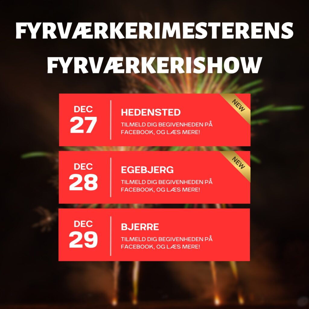 Fyrværkerimesteren har 4 fysiske salgssteder omkring Horsens og Vejle. Salgsstederne er placeret i Bjerre ved Hornsyld, i Egebjerg ved Horsens, Overholmvej i Hedensted og på Dandyvej i Vejle lige i Bilka-krysdet. Her har vi åbent for salg og udlevering af fyrværkeri fra d. 26.-31. december 2025. Her er god plads til parkering, og her er udlevering samme sted.