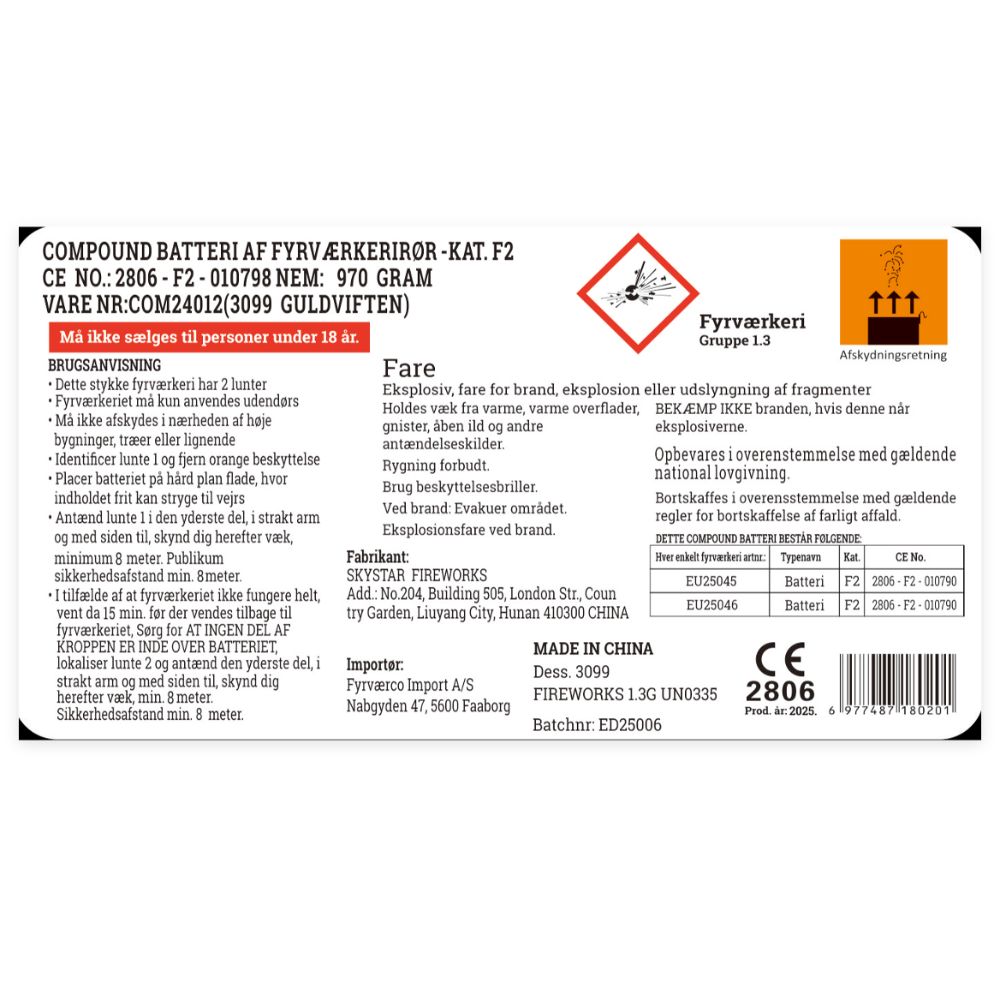 100 skuds viftebatteri. Ren guld! Et hurtiggående guldviftebatteri med guldmines, guldhaler og guld camura. Afsluttes selvfølgelig med en stor finale i ren guld