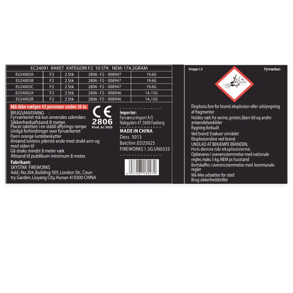 Raketsortiment med 10 stk. raketter. Assorterede farver