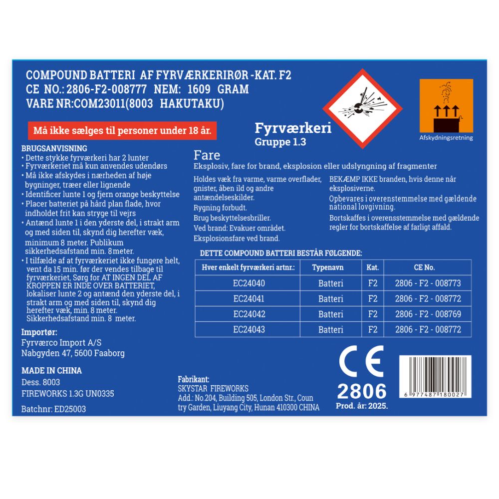 110 skuds batteri. 25/30 mm. Spektakulært fyrværkeri med kraftige effekter. Oplev guldfyrværkeri, neon-dahlier, strobe og farverige finale-effekter. Et fantastisk batteri med hele 1.609 gram NEM