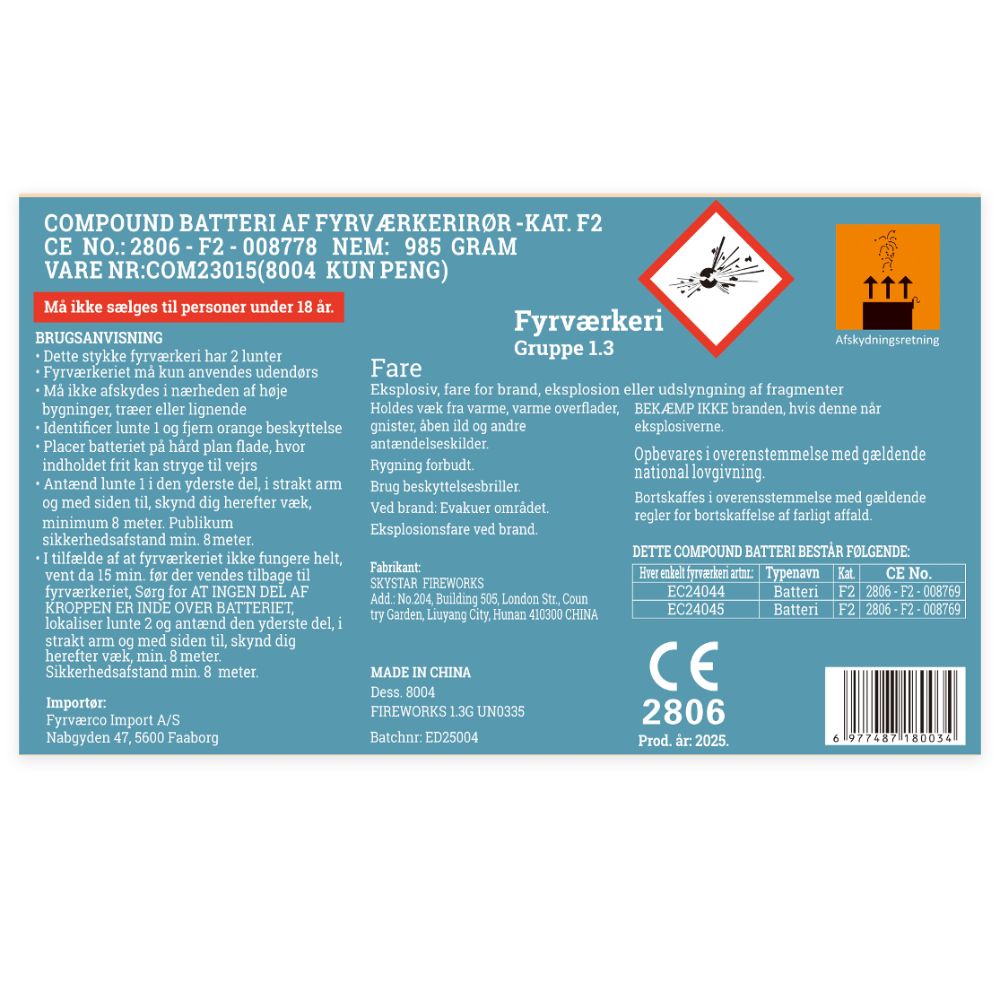 100 skuds batteri. 25 mm. Farverigt fyrværkeri kombinerer guldfyrværkeri med spinner-effekter og en spektakulær finale med sølv og crakling. Kun hos Fyrværkerimesteren
